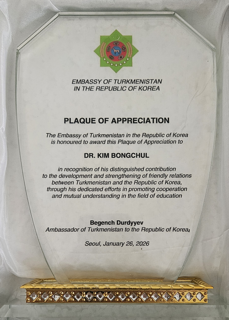 In January 26, 2026, Dr. Kim Bongchul, President of the Seoul Institute of Global Affairs (SIGA), was awarded a Plaque of Appreciation by the Embassy of Turkmenistan in the Republic of Korea.